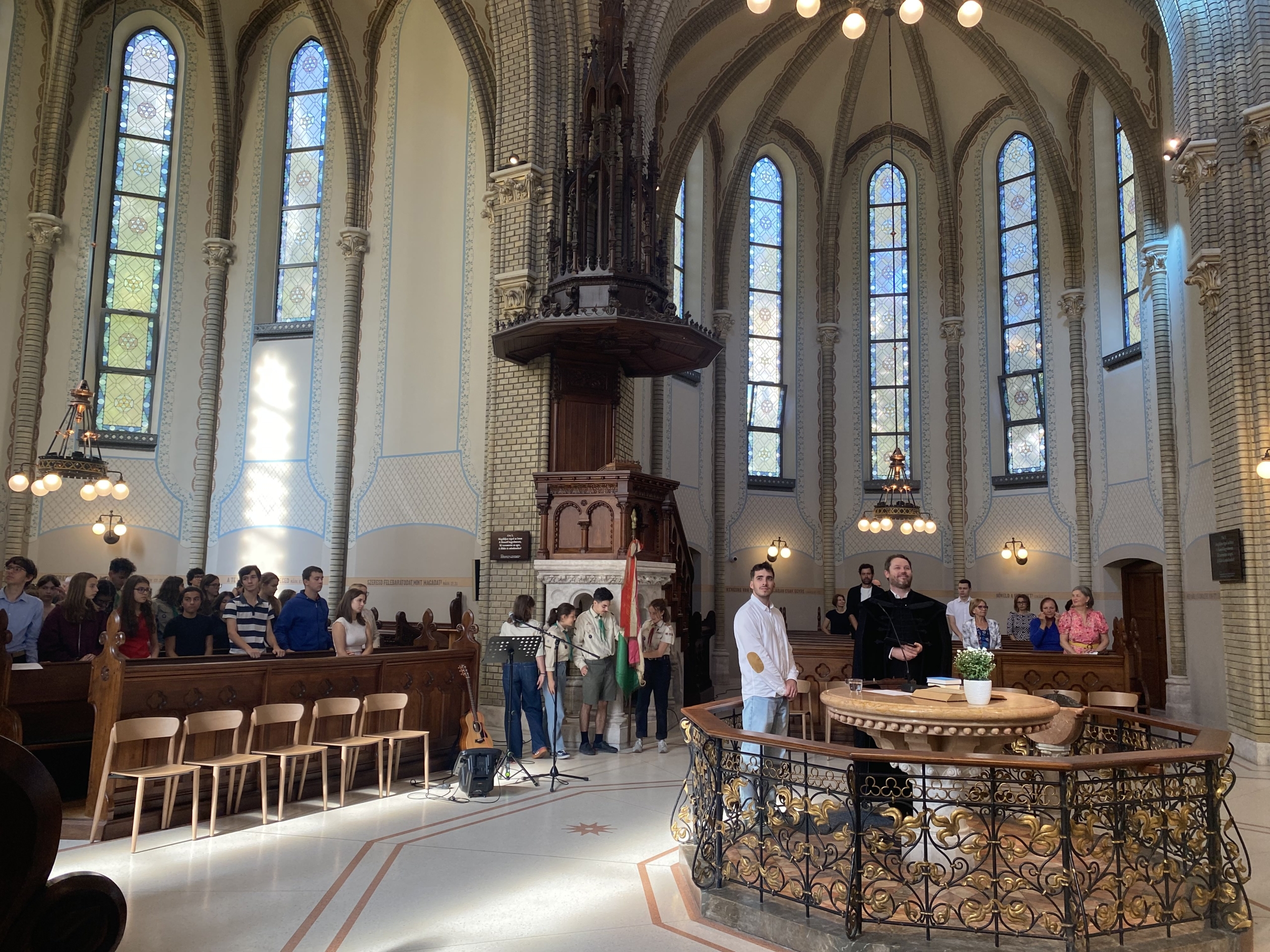 Az istentiszteleten mintegy 20 ifis és 40 cserkész vett részt aktívan. A cserkészek váltásban, zászlóval álltak végig a szószék előtt. A liturgiába több fiatal is bekapcsolódott. A gitáros éneklést Harmathy Balázs, gyülekezetünk új ifjúsági munkása vezette, aki ezen az alkalmon mutatkozott be közösségünk előtt. A közös énekek között szerepelt a Mennyben fenn a trónusnál és a Jézus nyájas és szelíd énekek. Az igehirdetés előtt egy ifis mondott imádságot, majd az igehirdetést követően három fiatal imádkozott a gyülekezetért, az ifjúságért és a jövőért. A perselyezést is a fiatalok végezték: az öt hajó mindegyikében egy-egy fiatal szolgált. Az alkalom zárásaként a résztvevők igés kártyákat kaptak, melyek elkészítésében a pénteki ifjúsági alkalom résztvevői segítettek.