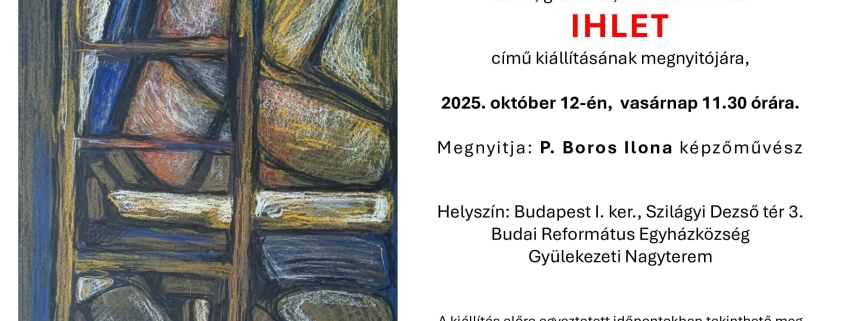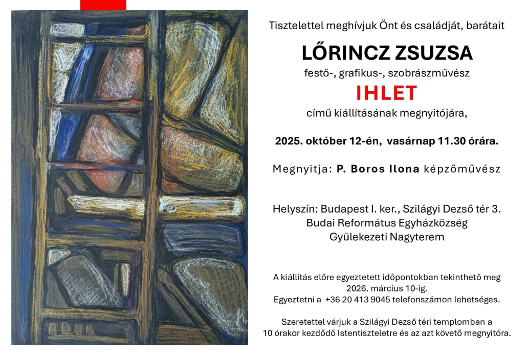 2025. október 12-én vasárnap, az istentisztelet után szeretettel várjuk a gyülekezet tagjait és minden érdeklődőt Lőrincz Zsuzsa IHLET című kiállításának megnyitójára.