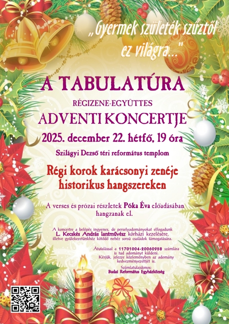 2025. december 22-én 18:00-tól a hagyományokhoz híven a Szilágyi Dezső téri református templomban kerül megrendezésre a Tabulatúra régizene együttes adventi koncertje.