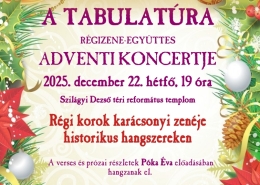 2025. december 22-én 18:00-tól a hagyományokhoz híven a Szilágyi Dezső téri református templomban kerül megrendezésre a Tabulatúra régizene együttes adventi koncertje.